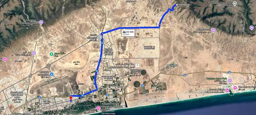 Located just 30 km from Salalah city center, Ain Razat is easy to reach by car—only a 20 to 35-minute drive. The roads are well-paved, and taxis or organized tours are also available for visitors who don’t want to drive.