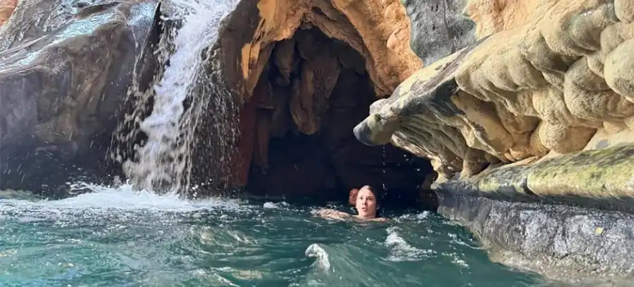 The highlight of Wadi Shab awaits at the end of the trail — a hidden waterfall cave accessible only by swimming through a narrow passage of crystal-clear water. Inside, a gentle waterfall cascades into a glowing turquoise pool, surrounded by smooth stone walls that echo with the sound of rushing water. It’s a moment that feels both thrilling and serene — the perfect reward after the hike.