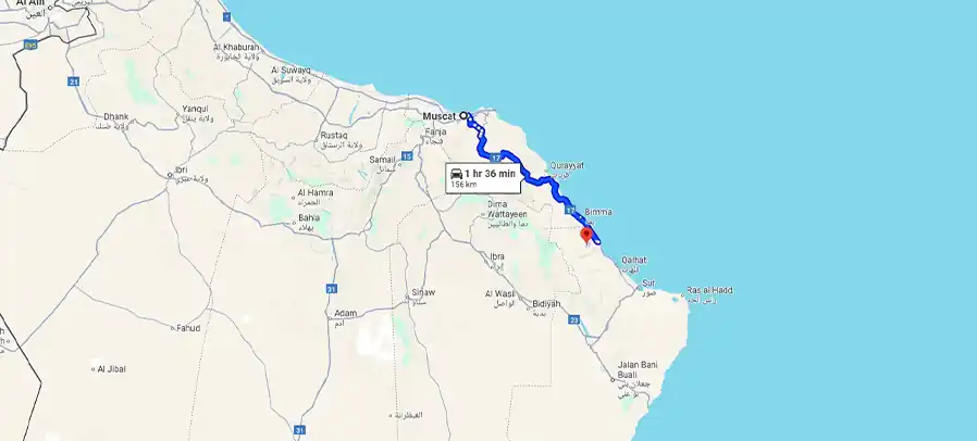 Wadi Shab is located in Tiwi, about 140 kilometers southeast of Muscat. The drive from Muscat takes around 1.5 to 2 hours via Route 17, a smooth and scenic highway. Once you arrive, you’ll find a parking area close to the entrance. From Sur, the trip is about 45 minutes. Renting a car is the best option, as public transport is limited.